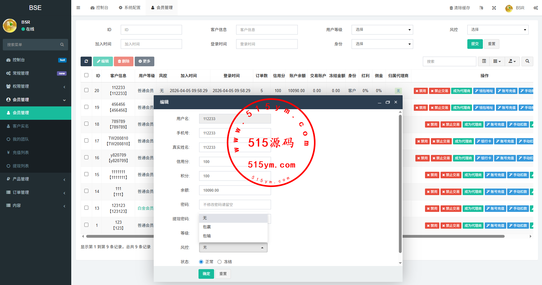 系统功能:信用分,实名认证,usdt充值提现,用户单控,订单控制等功能